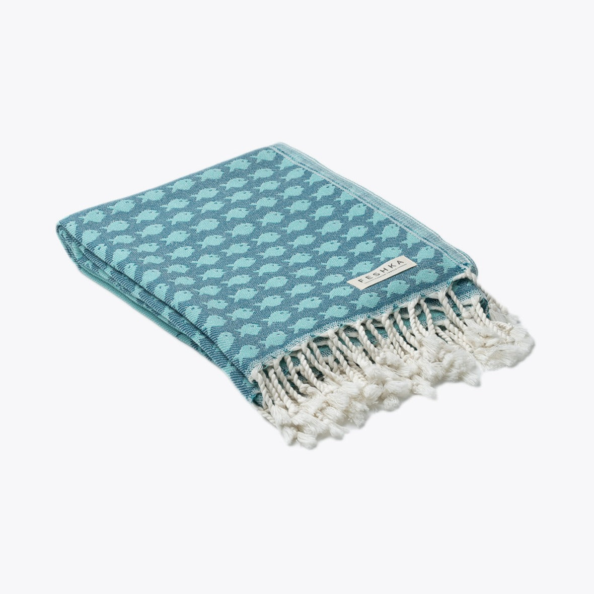 Big Fish is a versatile throw that brings playful, coastal storytelling into any space. Woven in tone-on-tone turquoise and teal, the design subtly forms a large fish mouth composed of two interlocking triangles, while the background features rows of small fish swimming in perfect formation. At first glance it reads as graphic and modern, but a closer look reveals its whimsical narrative, making it perfect for coastal-inspired interiors, beach cottages, or ocean enthusiasts.