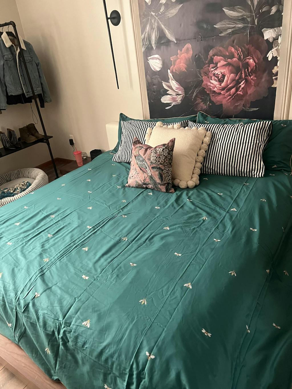 Wrap your bed in rich emerald green and delicate golden bees — a bedding set designed for those who love nature, elegance, and a touch of magic.
